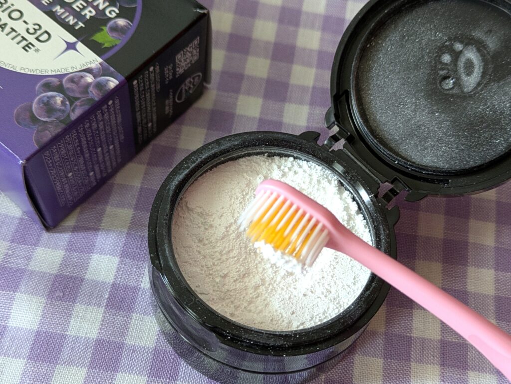 パウダー状なので、歯の表面だけでなく、裏側も奥も、すき間や歯と歯ぐきの間にも行き届くので、しっかりケアすることができます。パウダーに直接歯ブラシをつけて磨いたり、付属のスプーンですくって歯ブラシにのせて磨きます。