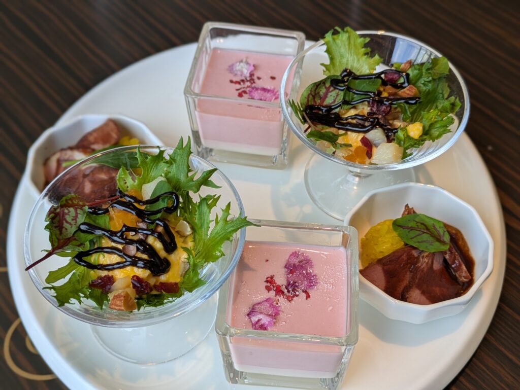 3段目には、ホワイトチョコレートとビーツのスープが美しい層をなす「ホワイトチョコレートのクリーム&ビーツの冷製スープ」は目にも鮮やか。カカオの風味とバルサミコ酢の甘酸っぱいコクで味わう「トリュフ風味の卵サラダ カカオドレッシングで」は、カカオニブやアーモンド、クルミの食感のアクセントも楽しい一品。