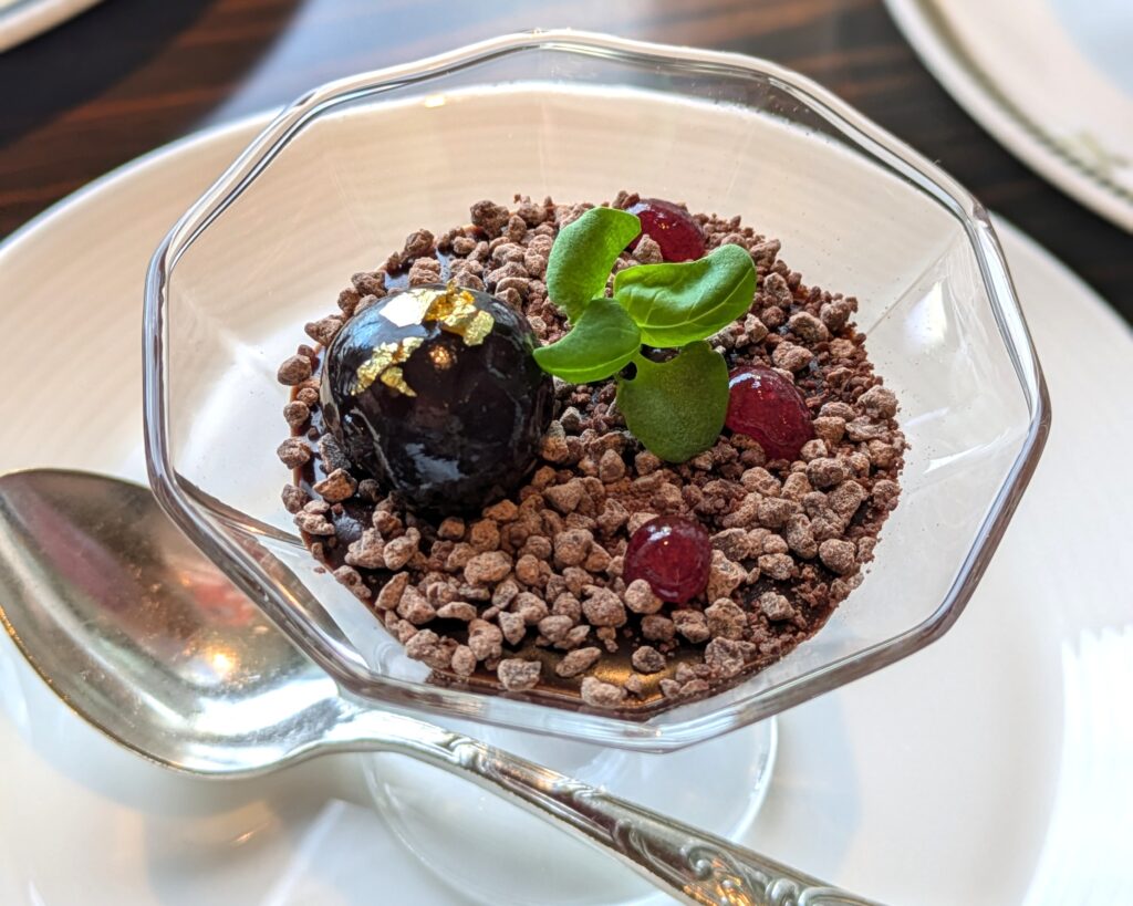 スペシャルデザートの「ショコラヴェリーヌ」は、さくらんぼのコンフィチュールとなめらかなチョコレートクリームを重ね、カカオパルプパウダーを練り込んだ酸味のあるチョコレートと、甘くビターな粒状のチョコレートをトッピング。金箔を添えたアマレナチェリーとバジルがアクセントとなり、味わいと香りの変化、そして遊び心あふれるビジュアルも印象的な一品です。