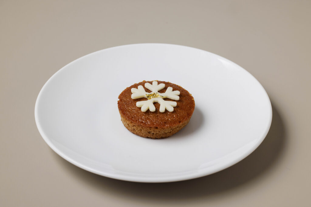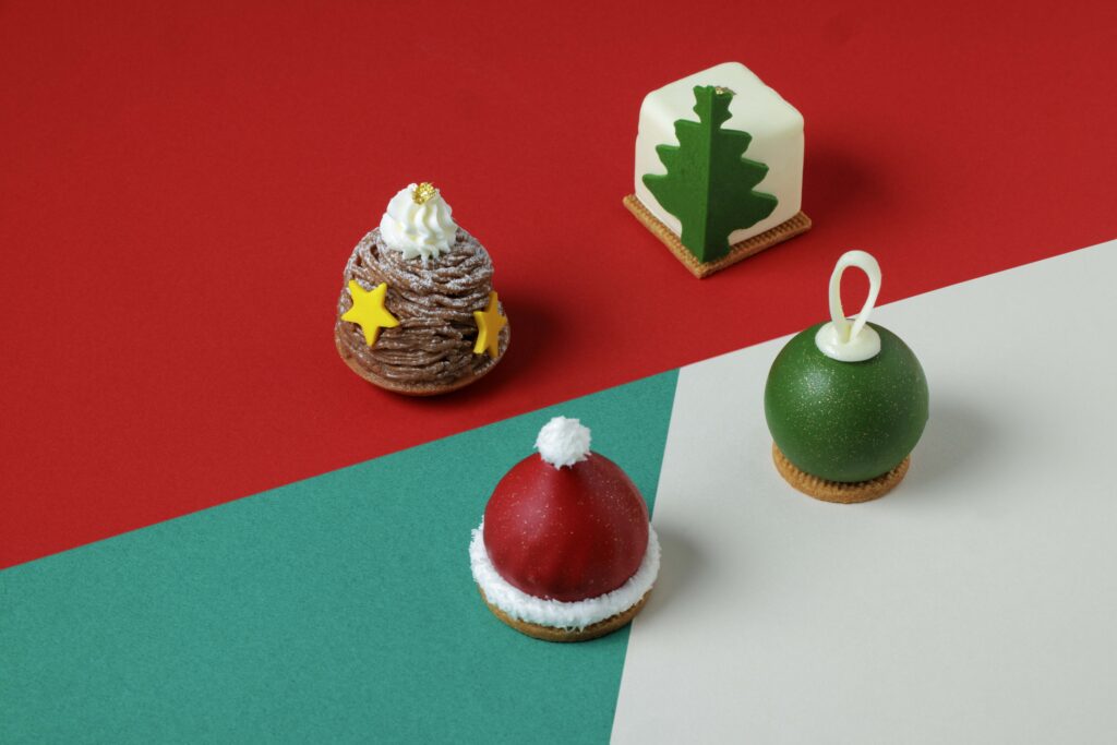 アフタヌーンティーの主役となるスイーツは、まさに冬のオーナメントを手元に並べたかのようなラインナップ。オレンジとアールグレイのゼリーをチーズムースで優しく包み、雪のようなホワイトチョコレートで仕上げた「クリスマス ツリー」は、グリーンのツリーチョコがきらめき、食べる前から心を奪います。