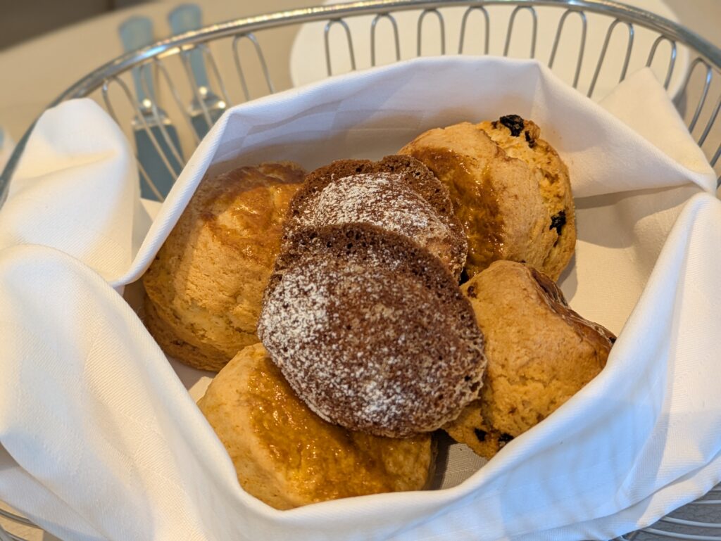 さらに、アフタヌーンティーの定番でもあるスコーンと、さっくりフワフワ食感で絶品のマドレーヌも♪ スコーンは、プレーンとレーズンの2種。焼きたてならではのおいしさが味わえるマドレーヌは、運ばれてきたら早めにいただくのがオススメです!