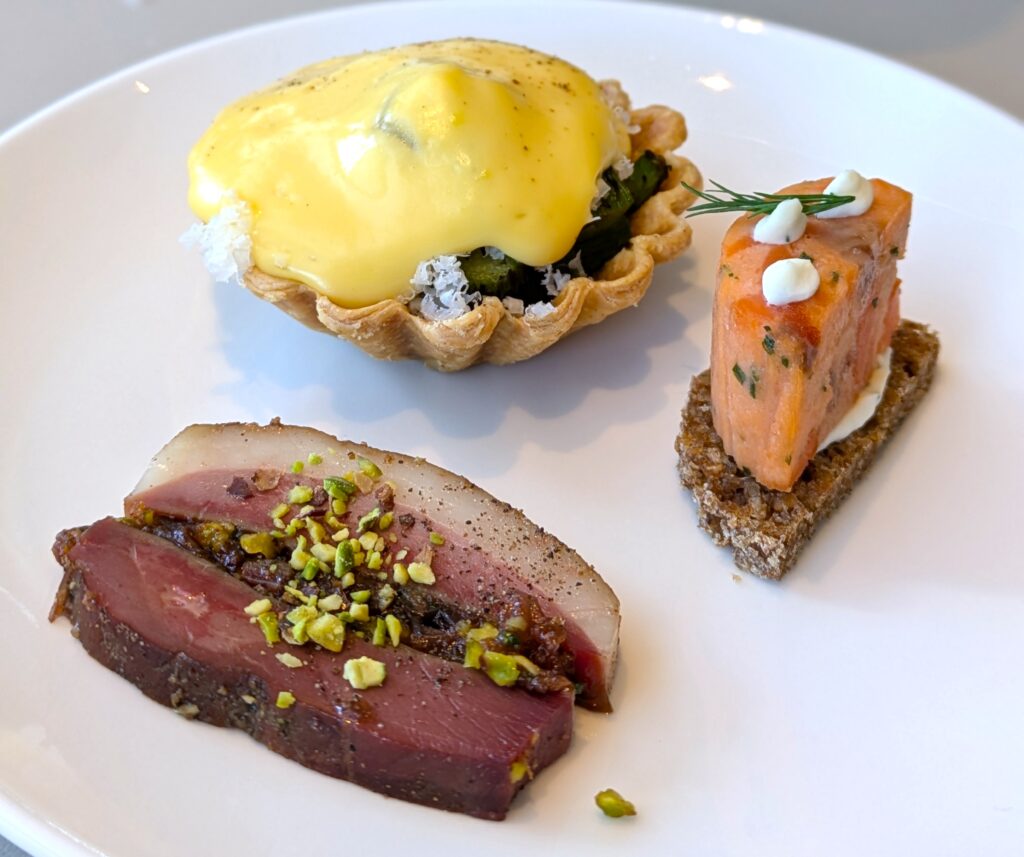 春の恵みを感じさせるアスパラガスがたっぷり堪能できる「アスパラガスのタルト キャラメライズドオニオン オランデーズソース」や、旬の桜鱒を楽しむ「桜鱒 自家製ライブレッド ディルクリームチーズ」、鴨の旨みと果実味が重なる「鴨のスモーク グリオットチェリーとピスタチオ」など、いずれもアフタヌーンティーの枠を超えた完成度。