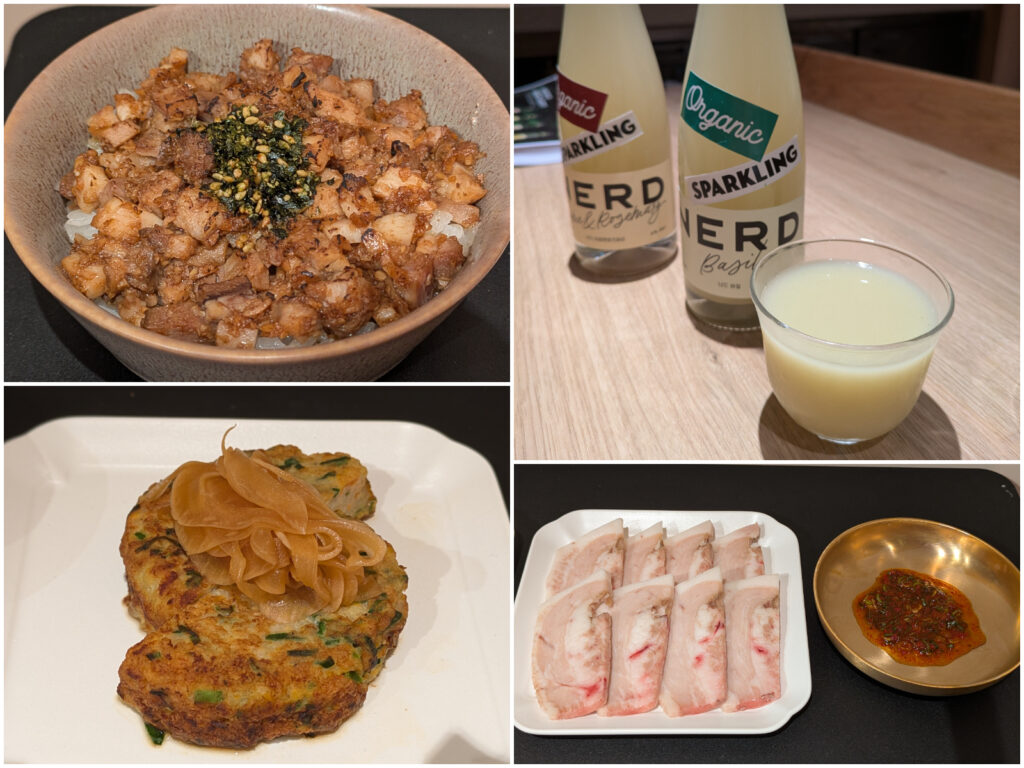 さらに、お酒のおつまみに最適な韓国風かき揚げ「海老ドングランテン」や、醤油とごま油の香ばしいソースで味わう「冷ジェユク」などの一品料理も揃います。